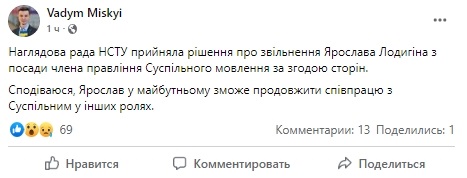 Він уточнив, що наглядова рада НСТУ задовольнила заяву про звільнення Лодигіна за згодою сторін і висловила сподівання, що в майбутньому Ярослав зможе продовжити співпрацю із Супільним "в інших ролях".