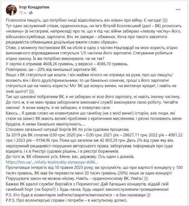 "Здесь один заслуженный певец, орденоносец по имени Виталий Козловский (далее - ВК) разносит "новость" о том, что я во время войны забираю "львиную долю" его, военнослужащего, зарплаты. Он, как всегда - обманывает. Хотя о таком упорном рецидивисте-обманщике целесообразнее употребить слово "лжет". Итак, с момента постановки ВК на учет в одну из частей Нацгвардии в мою пользу, согласно исполнительному внедрению, взимается 1/5 часть его зарплаты. Взимание делается по закону. Их же нужно выполнять, не правда ли? В августе я получил 4 608,26 гривен, в сентябре - 4 586,70 гривен. Повторяю, это - 20% от нынешней зарплаты ВК", - написал он.