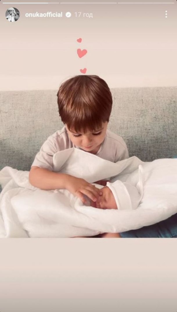 На нем можно увидеть, как ее трехлетний сын Александр держит на руках сестричку Лину, завернутую в конверт-одеяло, и нежно касается ее щечки.
