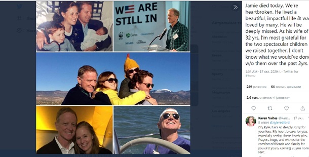 Она написала: “Джейми умер сегодня. Мы убиты горем. Он прожил красивую, яркую жизнь и был любим многими. Нам его будет очень не хватать. Как его жена, прожившая с ним 32 года, я очень благодарна за двоих замечательных детей, которых мы вместе воспитали. Я не знаю, что бы мы делали без них за последние 2 года”
