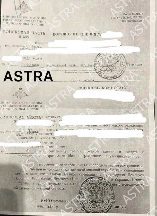 СМИ сообщает, что причиной смерти стали переломы ребер. Но родным оккупанта заявили, что тот "погиб под обстрелом".