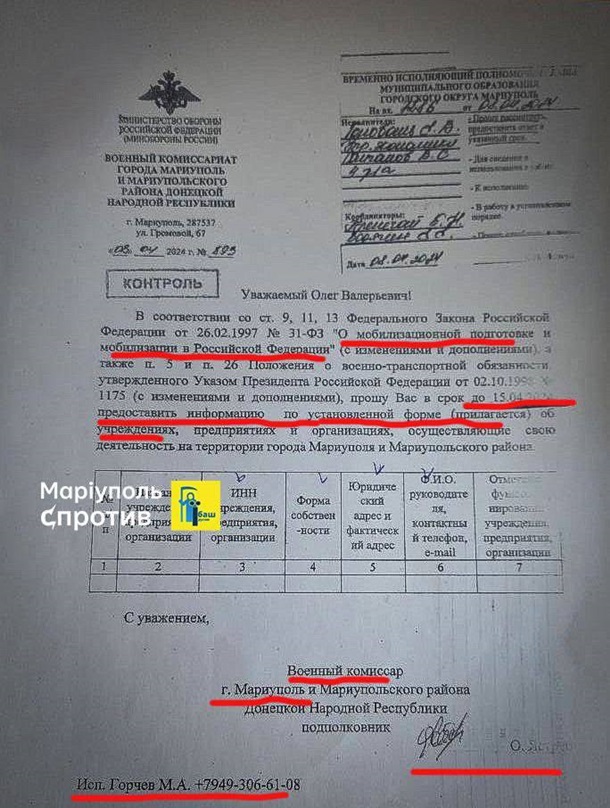 Сообщается, что 3 апреля оккупационный "военкомат" Мариуполя и Мариупольского района обратился в оккупационную администрацию с требованием предоставить все данные о предприятиях для проведения мобилизационных мероприятий.