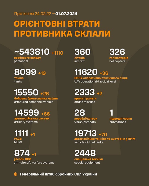 С 24 февраля 2022 по 1 июля 2024 года общие боевые потери личного состава российских войск на территории Украины ориентировочно составили 543 810 человек (+1110 за сутки). Об этом сообщил Генеральный штаб ВСУ.