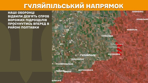 На Гуляйпольском направлении наши защитники отбили девять попыток вражеских подразделений продвинуться вперёд в районе Полтавки.