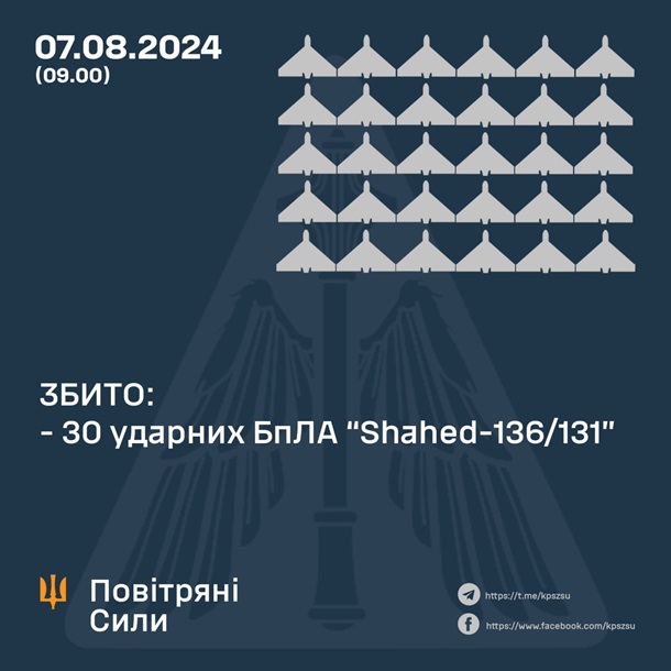 "В ночь на 7 августа 2024 года российские оккупанты атаковали ударными БпЛА типа Shahed из районов Приморско-Ахтарск, Ейск - РФ. Радиотехническими войсками Воздушных Сил обнаружено и сопровождено 30 ударных беспилотников. В результате противовоздушного боя все вражеские БПЛА сбиты в Киевской, Хмельницкой, Винницкой, Николаевской, Херсонской, Харьковской и Черкасской областях", - говорится в сообщении.