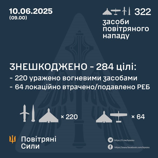 Российская армия в ночь на 10 июня атаковала Украину 322 воздушными целями, из которых 284 ликвидировали силы ПВО. Об этом сообщают Воздушные силы ВСУ во вторник, 10 июня.