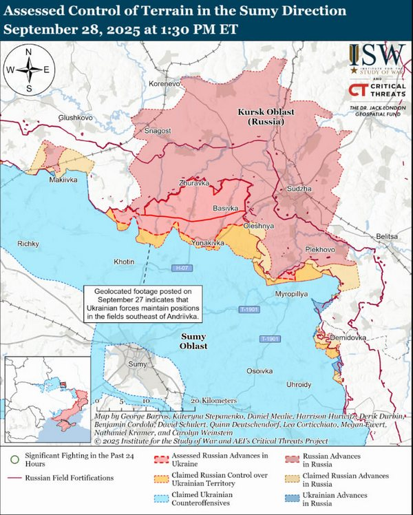 Согласно аналитике ISW, в Сумской области россияне не смогли добиться продвижения, столкнувшись с эффективным сопротивлением со стороны украинских сил, которые удерживают свои позиции или даже локально продвигаются вперед. А заявления России об успехе на юго-восток от Андреевки являются необоснованными.