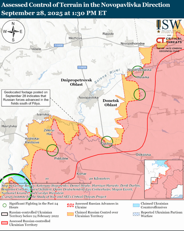В районе Новопавловского направления наблюдается некоторое продвижение российских войск. Как отмечает представитель украинского группирования Днепр, россияне пытаются обходить оборонительные позиции Украины небольшими группами и закрепляться в мелких населённых пунктах. Однако местность здесь, из-за своей открытости, становится неблагоприятной для успешного продвижения, особенно с наступлением осенних погодных изменений.