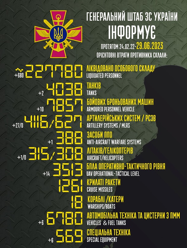 Силы обороны за минувшие сутки уничтожили 680 российских оккупантов. Общие боевые потери армии РФ с начала войны ориентировочно составили 227 780 человек. Об этом сообщает Генштаб ВСУ.