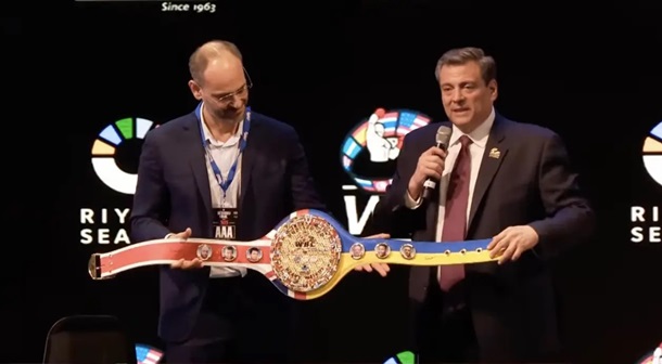 Президент WBC Маурисио Сулейман представил пояс, который будет стоять на кону в бою от этой организации. Награда выполнена в цветах украинского и британского флагов.