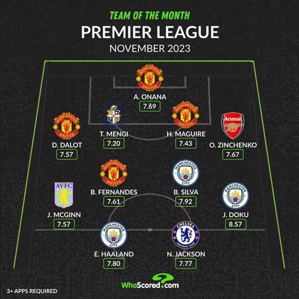А самое большое представительство в Манчестер Юнайтед. "Манкунианцы" выиграли все три своих поединка АПЛ в ноябре и делегировали в символическую сборную сразу четырех своих представителей: Бруну Фернандеша, Диогу Далота, Андре Онана и Гарри Магуайра.