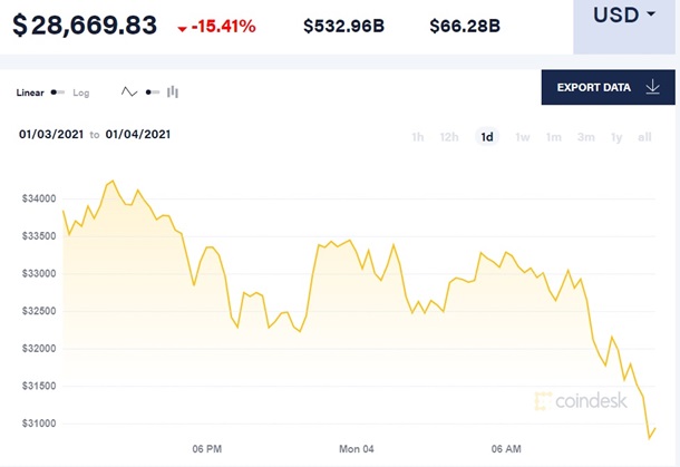 Стоимость самой популярной криптовалюты биткоина резко упала и опустилась ниже 29 тысяч долларов. Об этом свидетельствуют данные CoinDesk утром 4 января.