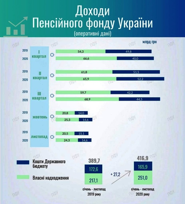 В общих доходах ПФУ средства государственного бюджета составили 165,9 млрд гривен, говорится в сообщении.