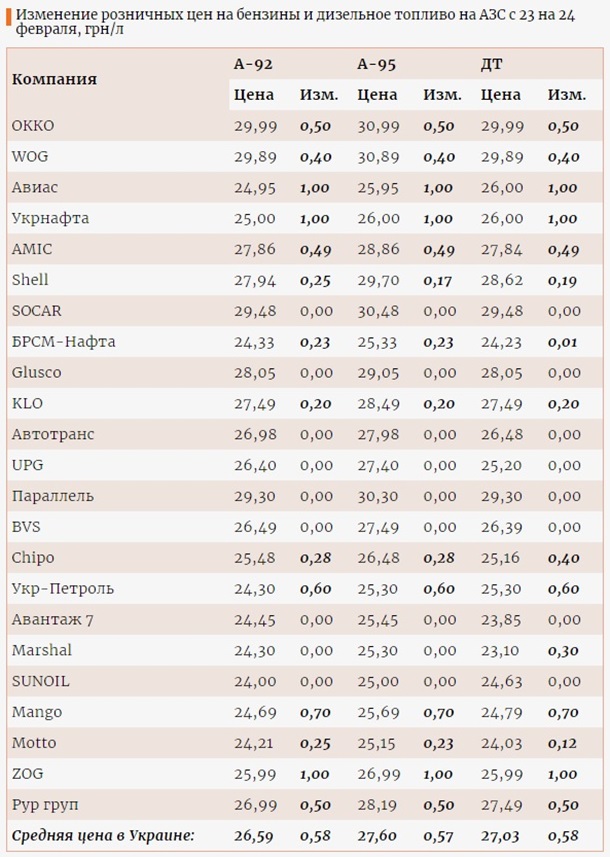 Також видання вказує, що ціни зросли після того, як напередодні найбільша консолідована мережа АЗС групи Приват (Авіас, ANP, Укрнафта та ін. - всього 1540 станцій) підняла ціни на бензин і дизельне паливо на 1 грн/л.