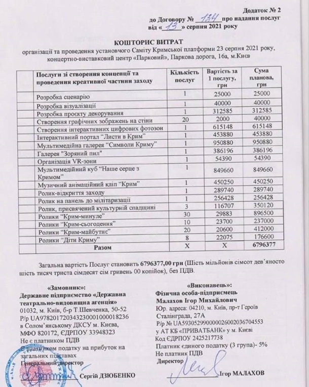 Замовником зазначено держпідприємство "Державна театрально-видовищна агенція", а виконавцем всіх робіт - ТОВ Малахов Ігор Михайлович, який є платником єдиного податку.
