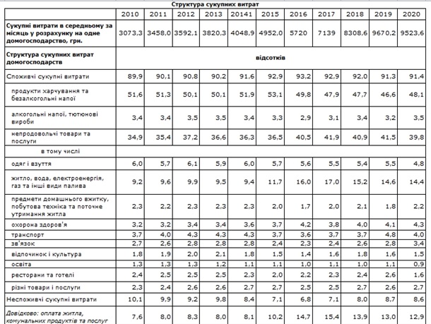 Сукупні витрати в середньому за місяць у розрахунку на одне домогосподарство у 2020 році становили понад 9,5 тисячі гривень.