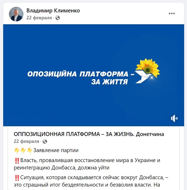ДБР зазначає, що напередодні воєнного вторгнення РФ затриманий на своїй сторінці у Facebook написав заклик до повалення української влади. Зараз на сторінці Володимира Клименка можна знайти пост від 22 лютого про те, що "влада, яка провалила відновлення миру в Україні та реінтеграцію Донбасу, має піти".