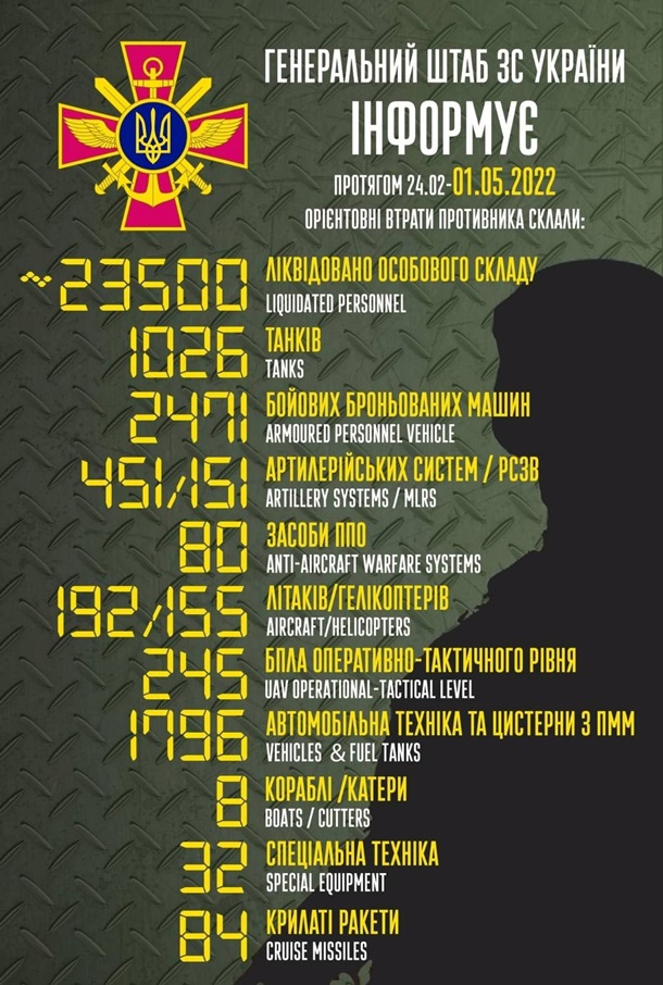 Загальні бойові втрати противника з 24.02 до 01.05 орієнтовно складають (у дужках наведено дані за минулу добу, 30 квітня):