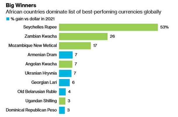 На першому місці з великим відривом розташувалася сейшельська рупія, яка завдяки відновленню туризму зміцнилася на 60%.