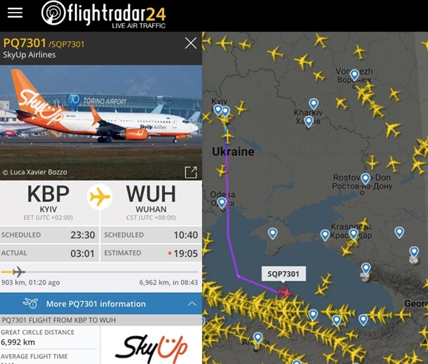 Планировалось, что самолет отправится в 2:50 ночи 19 февраля. Однако он отправился на 11 минут позже – в 3:01. По состоянию на 4:15 самолет находится над Черным морем и направлялся в Казахстан в аэропорт Алматы. Оттуда борт отправится в Ухань.