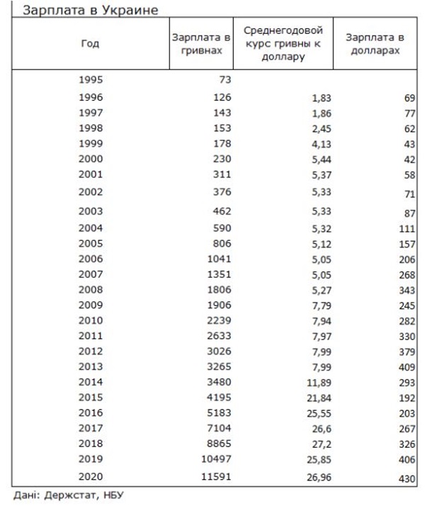 В сравнительной таблице указана зарплата в гривнах и в пересчете на доллары в зависимости от курса.