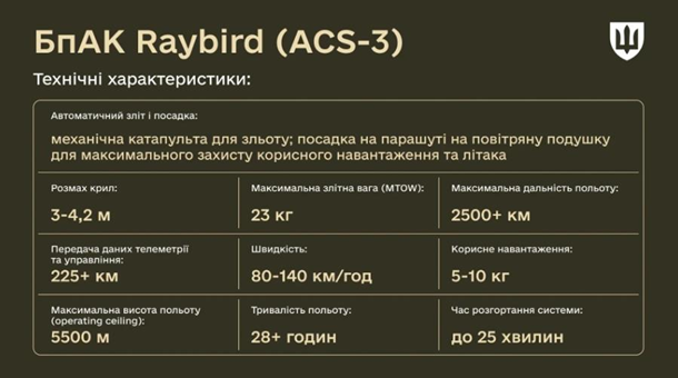 Отмечается, что появление БПЛА Raybird (среди военных более известен как ACS-3) привело к переформатированию всех существующих классификаций беспилотников. А все потому, что маленький самолет (до 25 кг) может выполнять задачи, которые обычно подчиняются лишь гораздо большим комплексам.
