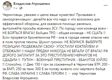 "Закликаю до самоорганізації: робіть все, що треба і що можливо для ефективної оборони, для надання допомоги пораненим, виконуйте прохання військових ЗСУ. По місту моя команда всім - не боятися ворога! <...> Якщо прорветься бронетехніка РФ - вона у місті менш небезпечна, ніж у полі проти піхоти. Шумить голосно - не боїмося, підбігли збоку - почастували коктейлем та відбігли. <...> Чернігів не здамо! <...> Спокійно. Даю 150 тисяч гривень за спалений у Чернігові БТР; 200 - за БМП, 250 - за танк; 300 доларів за голову живого чи мертвого бійця РФ", - написав Атрошенко.