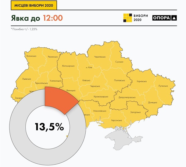 По состоянию на 12:00 свой голос на местных выборах в Украине успели отдать 13,5% избирателей, завили в ОПОРЕ.