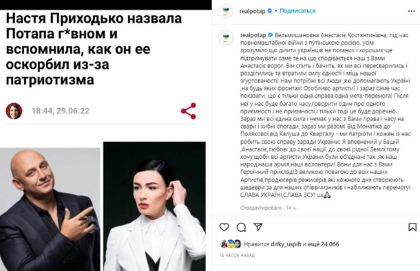 Українська співачка Анастасія Приходько напала на свого колегу та продюсера Потапа. Вона зробила репост новини про заяву репера та його дружини Насті Каменських про те, що вони не виступатимуть у РФ, і обізвала Потапа г*мном. Повідомлення з'явилося у Facebook Приходько.