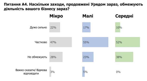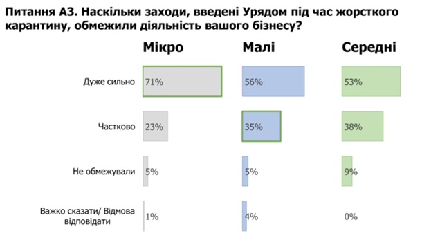 Меры адаптивного карантина оценили как очень сильные 22% владельцев микропредприятий, среди малых предприятий - 17% и 10% у средних предприятий. Большинство опрошенных оценили влияние нынешних ограничений как частичные.