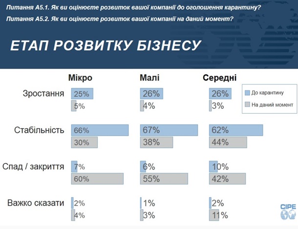 Доля предприятий на этапе спада и закрытия возросла с 7% до 59%. Среди представителей микробизнеса 60% оценивают текущее положение как спад, у среднего бизнеса доля таких оценок 42%. Доля предприятий, владельцы которых оценивают свое состояние как рост, сократилась с 25% до 5%.
