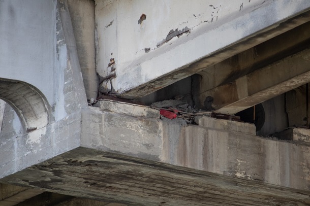 Простыми словами: диафрагма – это бетонная перемычка, расположенная перпендикулярно к основной пролетной балке, как вертикальное крылышко. На каждой из диафрагм имеются металлические пластины. Именно эта конструкция не дает «опрокинуться» пролетным балкам и сохраняет пролет моста в том состоянии, которое мы привыкли видеть. Данный узел при всей своей незаметности, на самом деле очень важен для правильной работы пролета моста и, соответственно, для безопасности. Вот как должна выглядеть правильная диафрагма после ремонта.