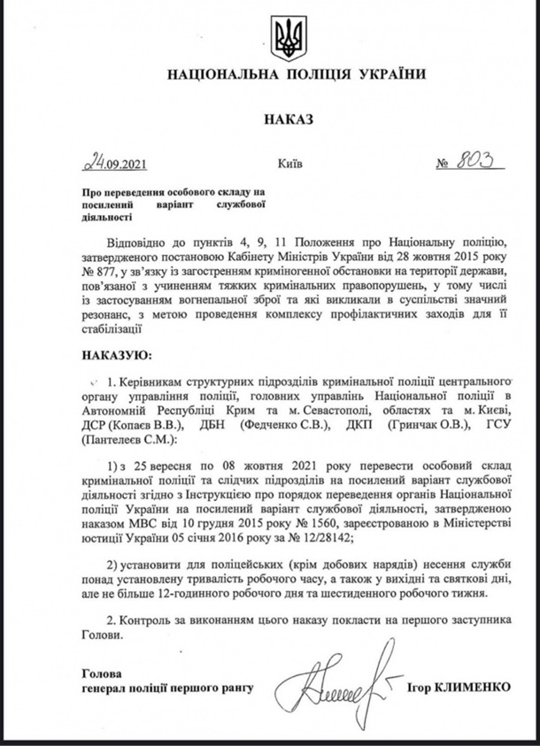 Глава Нацполіції Ігор Клименко наказав з 25 вересня по 8 жовтня перевести весь особовий склад кримінальної поліції і слідчих підрозділів на посилений режим роботи. Про це напередодні ввечері повідомила Українська правда, яка оприлюднила скан відповідного наказу.