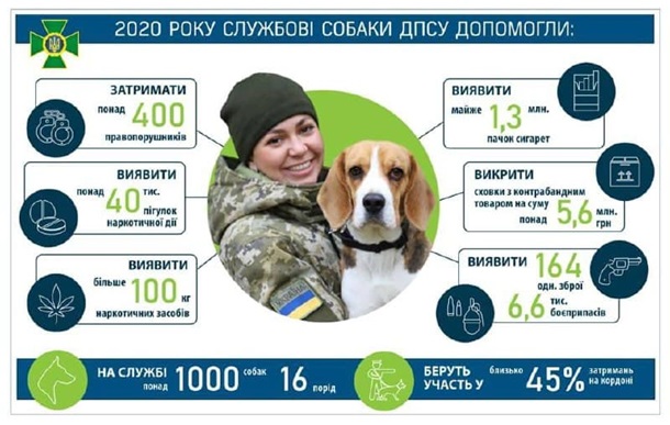 "Благодаря четвероногим помощникам разоблачили тайники с контрабандным товаром на сумму более 5,6 млн гривен. Сегодня в пограничном ведомстве служат более 1000 собак 16 пород. Часть из них привлечено к службе в районе проведения ООС. Инструкторов с собаками готовят в Кинологическом учебном центре Госпогранслужбы, что в Великих Мостах Львовской области. Большинство собак тренируют на поиск оружия, взрывоопасных веществ и наркотических средств", - говорится в сообщении.