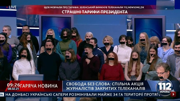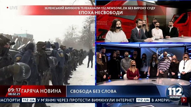 Также, сотрудники трех закрытых каналов ZIk, 112 и NewsOne вышли в эфир с заклеенными ртами в знак протеста.