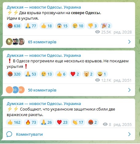 Думська повідомляє про дві збиті ворожі ракети в Одесі.
