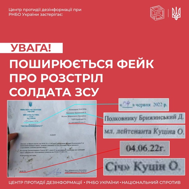 У мережі поширюється фейк із рапортом про розстріл солдата. Про це повідомляє центр протидії дезінформації РНБО.