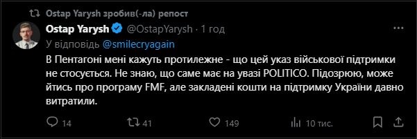 "В Пентагоне мне говорят обратное - что этот указ военной поддержки не касается. Не знаю, что именно подразумевает Politico. Подозреваю, может идти речь о программе FMF, но заложенные средства в поддержку Украины давно потратили", - написал Ярыш.