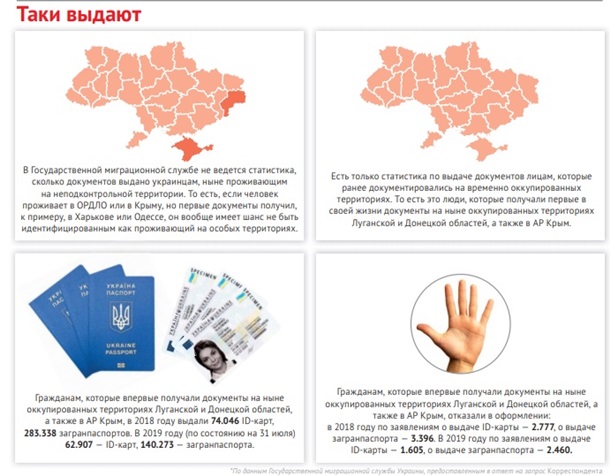 При этом желающих, даже несмотря на такие трудности, оформить украинские документы, хватает. В ГМС не ведется отдельная статистика того, сколько документов выдано украинцам, ныне проживающим на неподконтрольной территории. Но есть статистика по выдаче документов лицам, которые ранее документировались на временно оккупированных территориях. То есть это люди, которые получали первые свои документы в жизни в оккупированных частях Луганской и Донецкой областей, а также в АР Крым и которым пришлось собирать дополнительные сведения ради получения украинских биометрических документов.