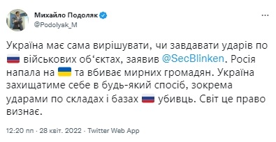 "Росія напала на Україну і вбиває мирних громадян. Україна захищатиме себе будь-яким способом, у тому числі ударами по складах та базах убивць у РФ. Світ це право визнає", - написав Подоляк у Twitter.