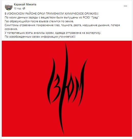 Про те, що могла бути використана хімічна зброя, повідомив колишній депутат міської ради Ізюма Микита Каракай, але інформація потребує підтвердження.