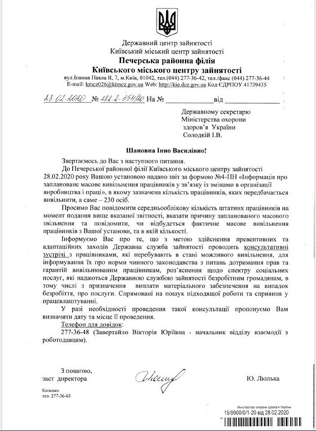В рамках реорганизации в Минздраве планируют уволить более 200 человек. Об этом пишет в среду, 4 марта, LB.ua со ссылкой на письмо Печерского филиала Киевского городского центра занятости госсекретарю министерства Инне Солодкой.