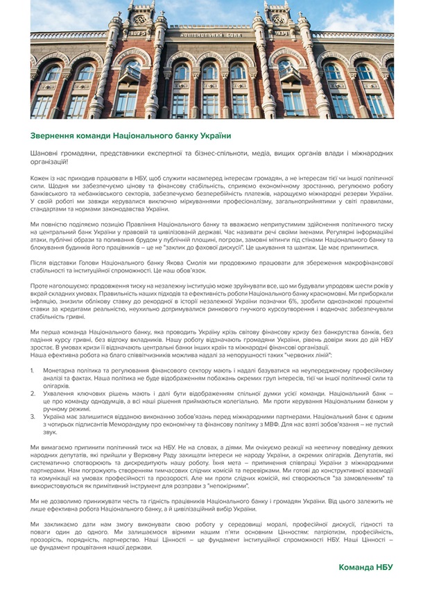 Команда Национального банка опубликовала обращение к гражданам, экспертам, медиа, высшим представителям власти и международным организациям, где говорится о политическом давлении. Об этом говорится в заявлении НБУ, опубликованном в Facebook во вторник, 7 июля.
