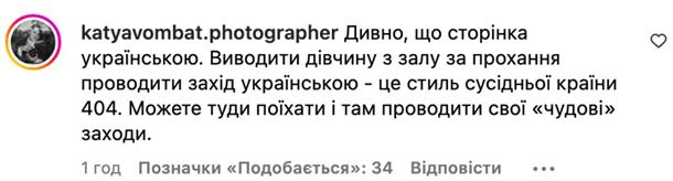 Присутні у залі почали закидати учасниці, щоб вона не заважала спікеру і щоб найняла собі перекладача. Зрештою дівчину вивели із залу, "бо вона зриває захід, на який і так було складно продати квитки".