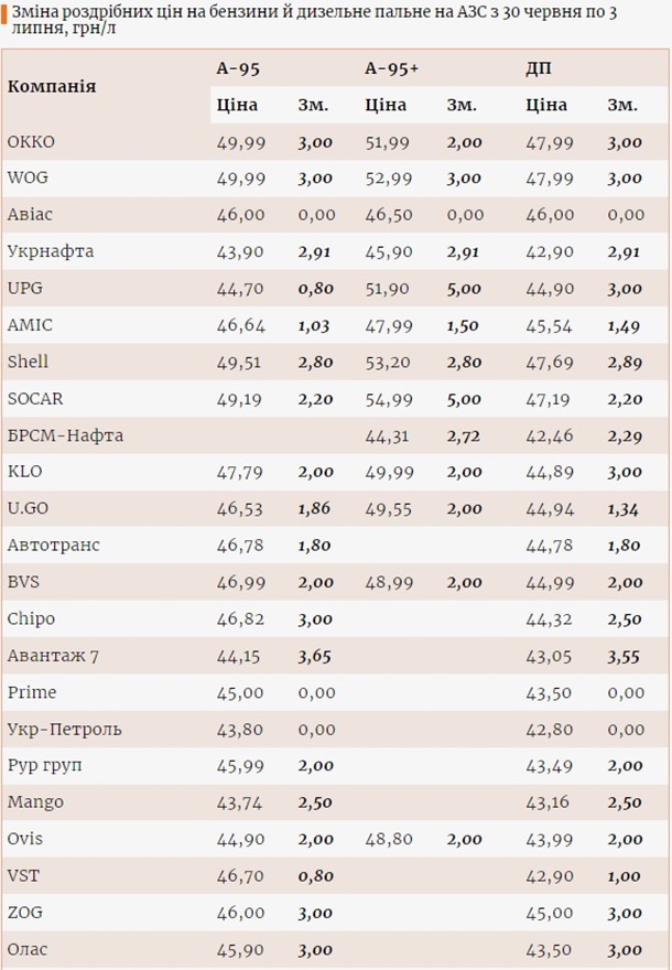 Средняя цена по стране на бензин А-95 выросла на 1,98 грн/л и составила 46,84 грн/л, бензин А-95+ подорожал на 2,42 грн/л до 49,61 грн/л, а дизельное топливо - на 2,03 грн/л, до 45,44 грн/л (см. табл.).