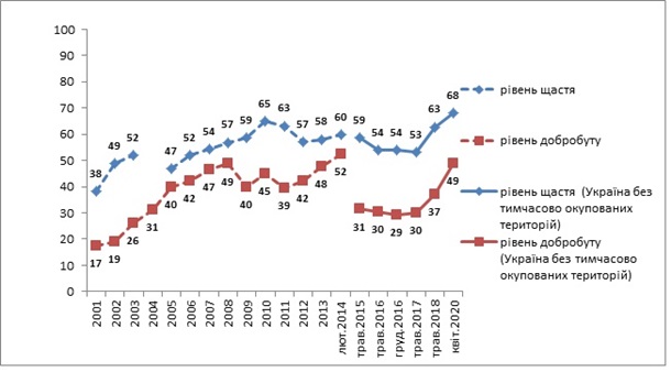 В апреле 2020 года счастливыми или скорее счастливыми себя чувствовали 68% жителей Украины, частично счастливыми, частично нет ощущали себя 14% и 16% в основном или вовсе не считали себя счастливыми.