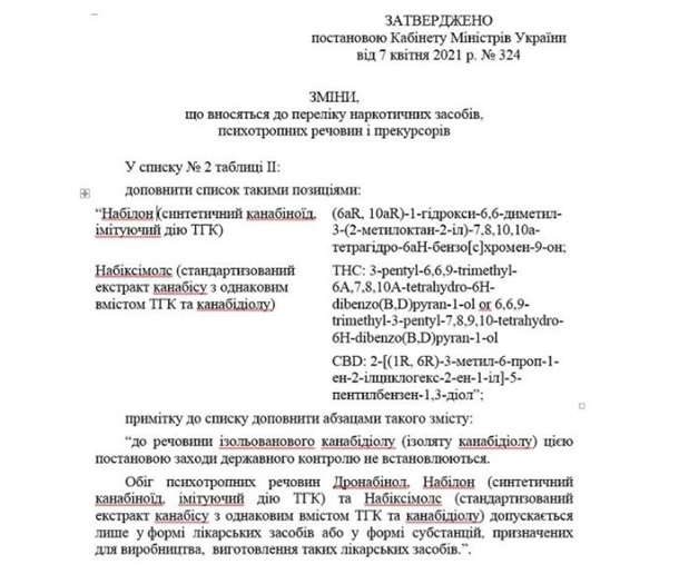 Уряд України виключив зі списку наркотичних засобів, психотропних речовин і прекурсорів деякі препарати на основі канабісу. Постанову №324 від 7 квітня опубліковано на урядовому порталі.