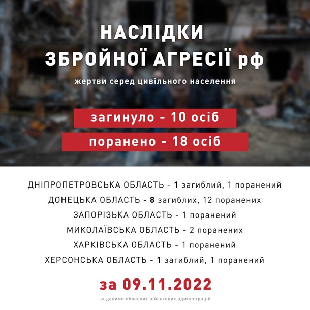 Станом на 9.00 четверга внаслідок атак РФ загинули п'ять цивільних та 18 отримали поранення. Крім того, виявлено тіла п'яти вбитих раніше.