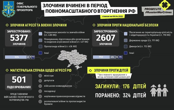 За час війни в Україні від дій російських військ загинуло 176 дітей, семеро з них - минулої доби, ще понад 324 маленьких українців дістали поранення. Про це у суботу, 9 квітня, повідомляє Офіс генпрокурора.