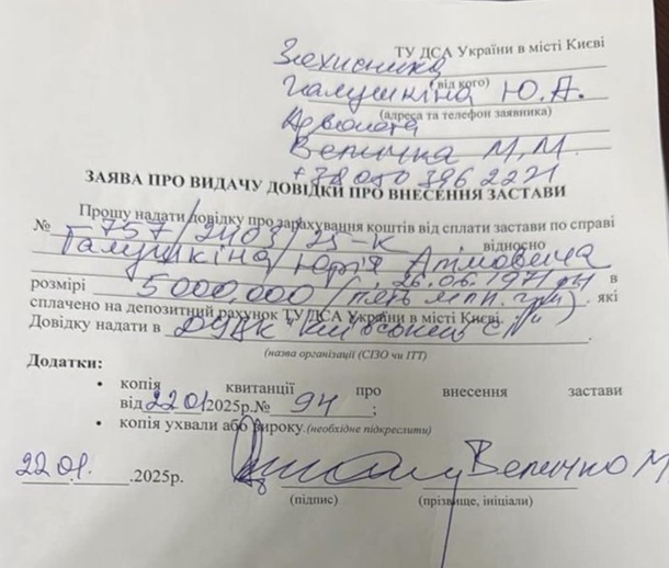 Заявление о внесении залога за Юрия Галушкина. Фото: Михаил Величко / Фейсбук